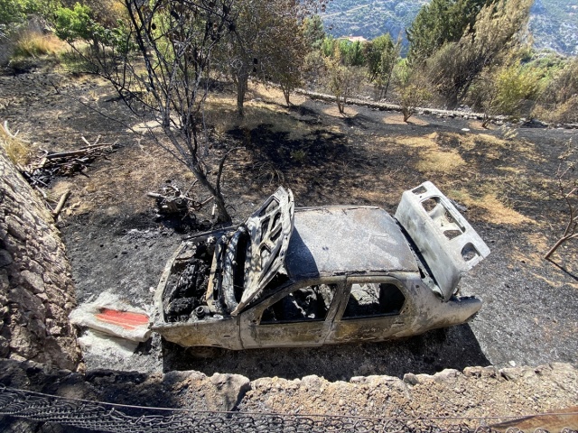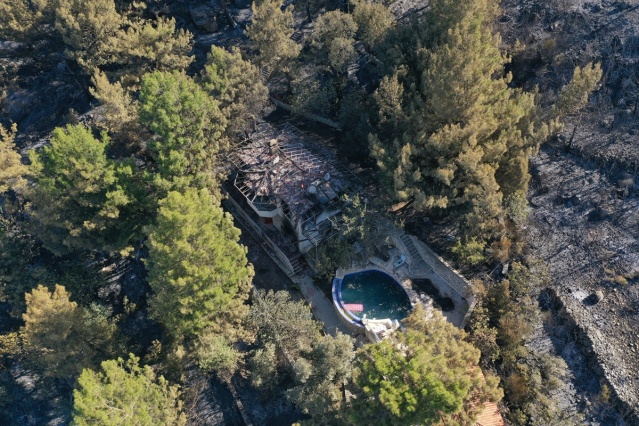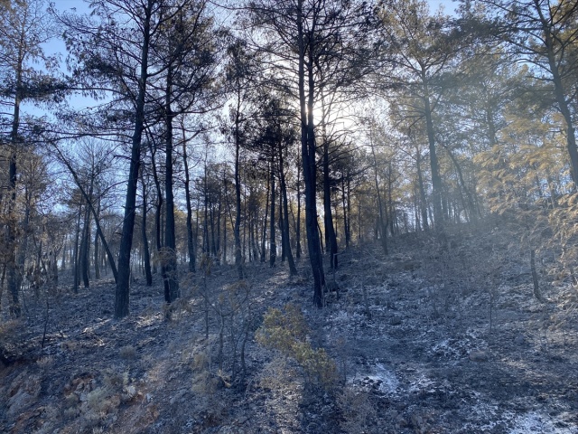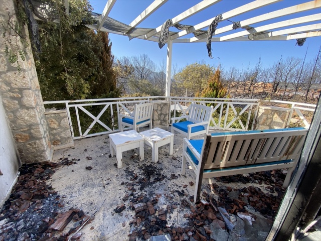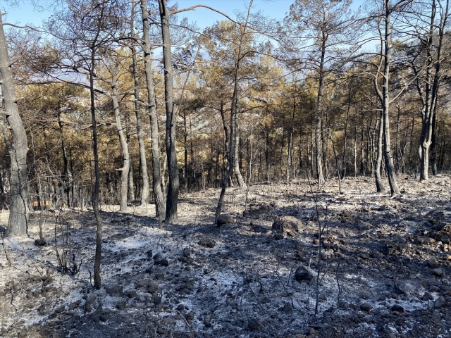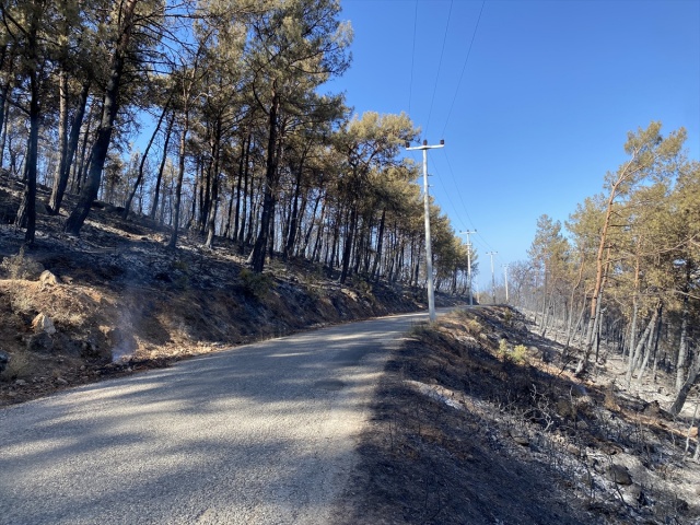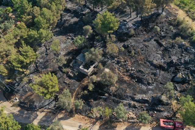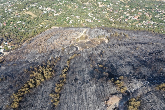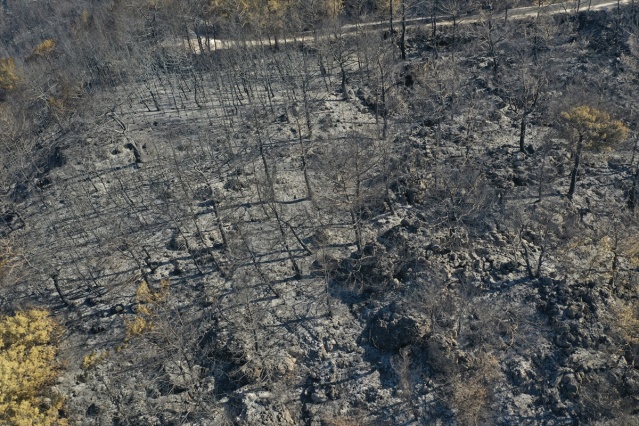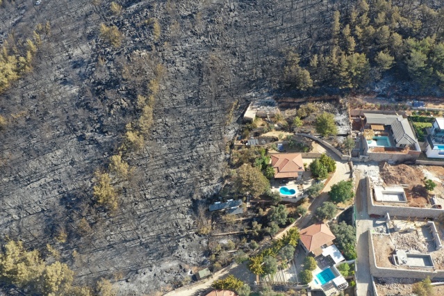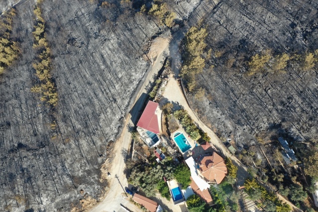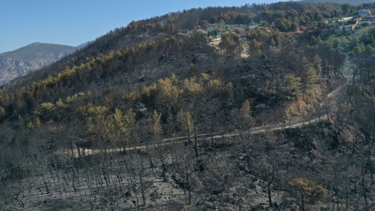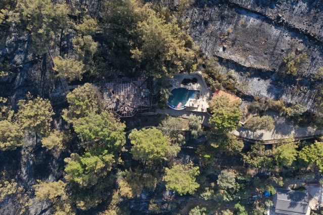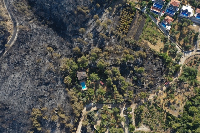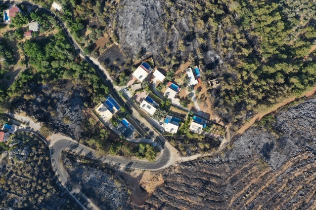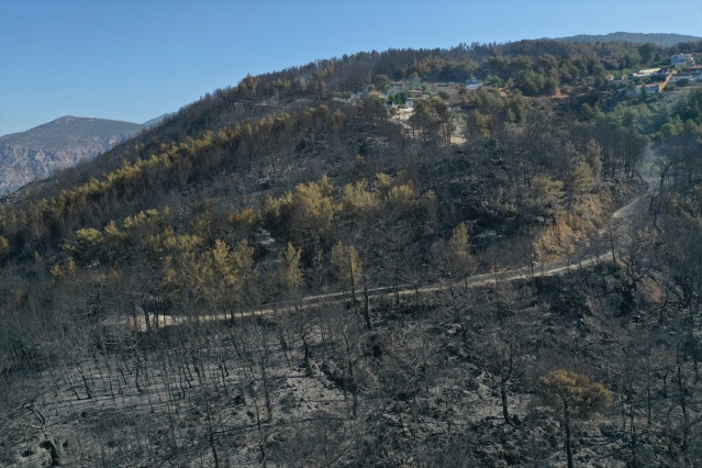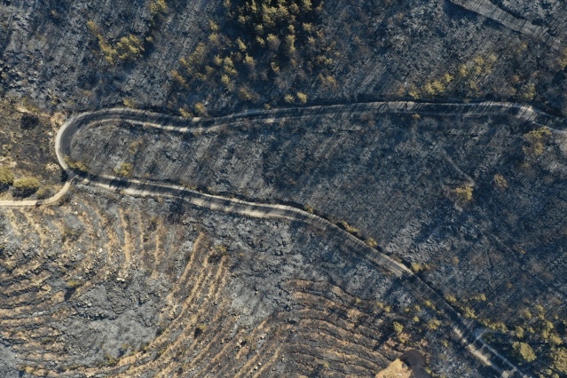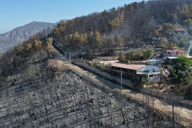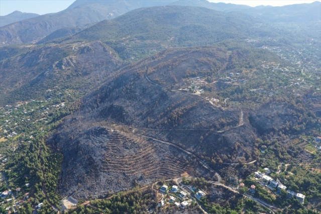 Antalya'nın Kaş ilçesindeki orman yangınında zarar gören alanlar havadan görüntülendi. Ekiplerin bölgede gece boyunca sürdürdüğü soğutma çalışmalarını tamamlamasının ardından günün ağarmasıyla alevlerin neden olduğu tahribatın boyutu da gözler önüne serildi.