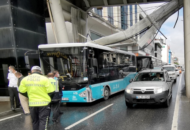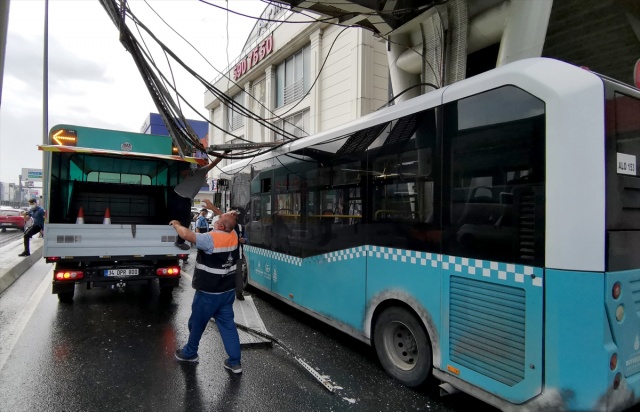 Avcılar'da metrobüs durağı üst geçidinin altındaki elektrik kablolarının halk otobüsünün üstüne devrilmesi nedeniyle bölgede trafik oluştu.