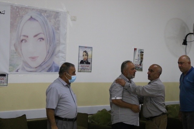 İsrail askerlerinin açtığı ateş sonucu hayatını kaybeden genç akademisyen Mey Affane için işgal altındaki Batı Şeria'nın Ramallah kentinde taziye merasimi düzenlendi. Taziyeleri, Mey Affane'nin babsı Halid Affane (sağ 2) kabul etti.