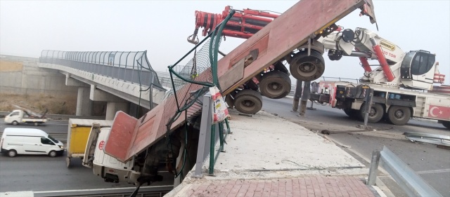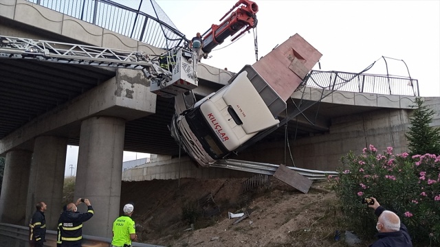 Kocaeli'nin Gebze ilçesinde yoldan çıkarak viyadükte asılı kalan tırdaki yaralı sürücüyü itfaiye kurtardı.