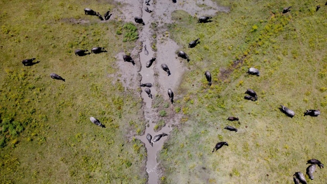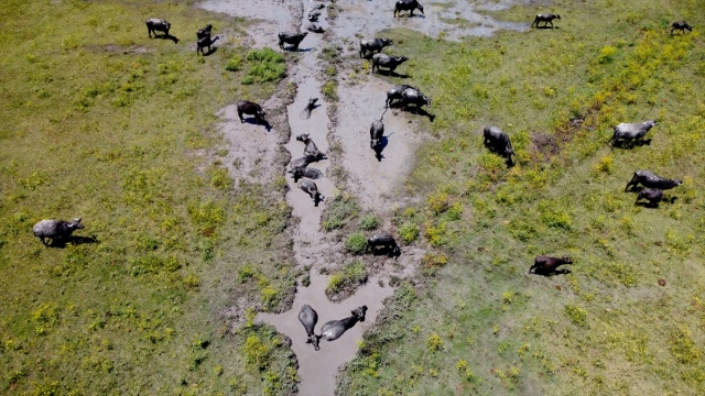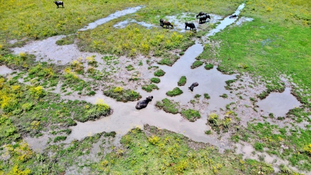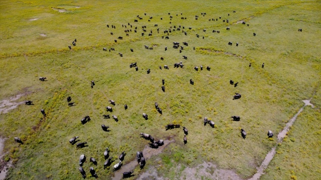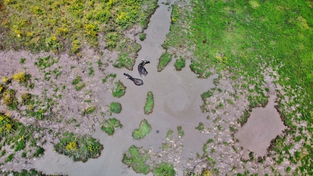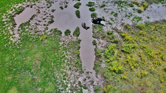Osmaniye'de sıcaktan bunalan mandalar çamurlu suda serinliyor