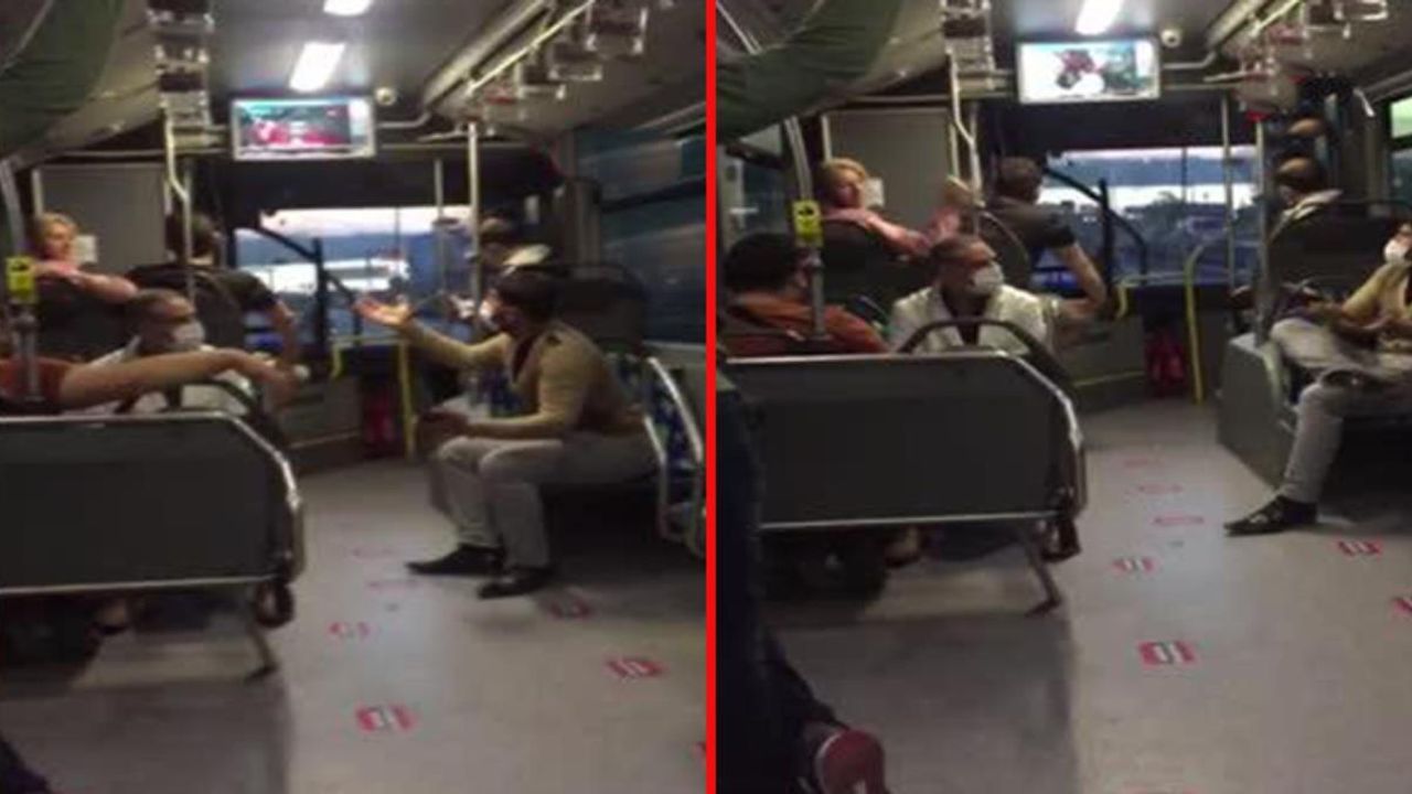 Kadın ve erkek yolcu arasında çıkan 'bacak bacak üzerine attın' kavgası kameraya yansırken, olay sırasında tansiyon yükselince diğer yolcular da duruma müdahale etti.